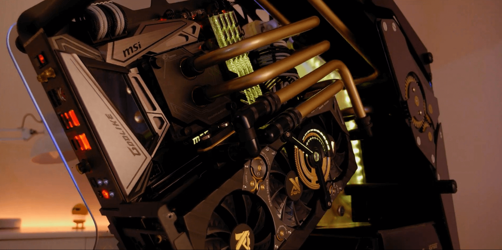 Maybe all of us have heard the name of SteamPunk. Contents, mainly science fiction inspired by 19th-century industrial steam-powered machinery have been popular in the world of entertainment and art for a long time. There exist a lot of movies, anime, comics, and other entertaining contents, arts on Steampunk. There is also a movie called Steamboy which is based on this. We have tried to push our creativity level to match with this popular and old subgenre and thus tried to express it in a different way. Our build is inspired by this movie. Even the build name follows it. In every inch of the build, you will able to relate the build with Steampunk. Starting from the side panel, the custom cooling threads to the GPU itself, the theme was indeed present.