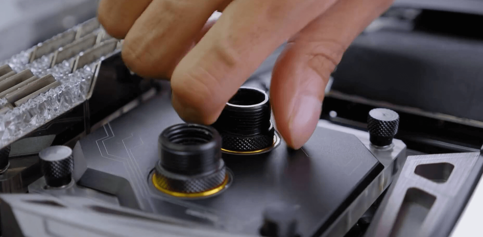 A new problem showed up when the builders completed assembling other components and started to setup the water loop with the GPU. The thread size of the GPU was too small compared to that of the default thread size of the custom loop. It was a very important factor, if the respective sizes wouldn’t match, leakage could happen. Eventually, the builders had to build an adapter to make the GPU fit with the thread.