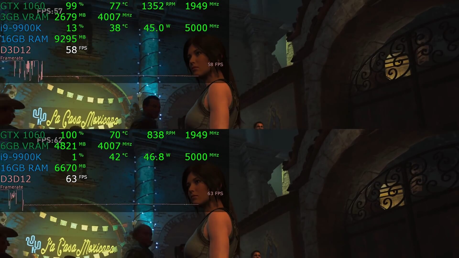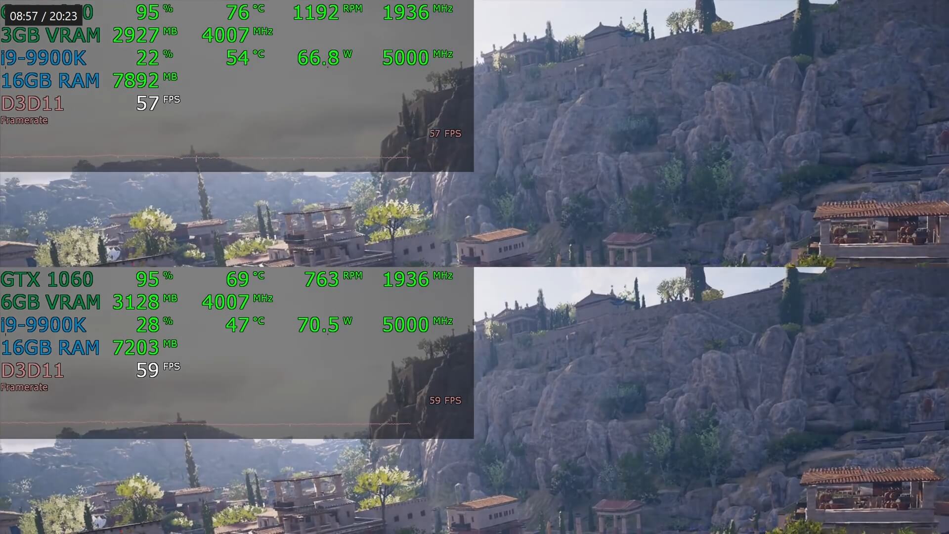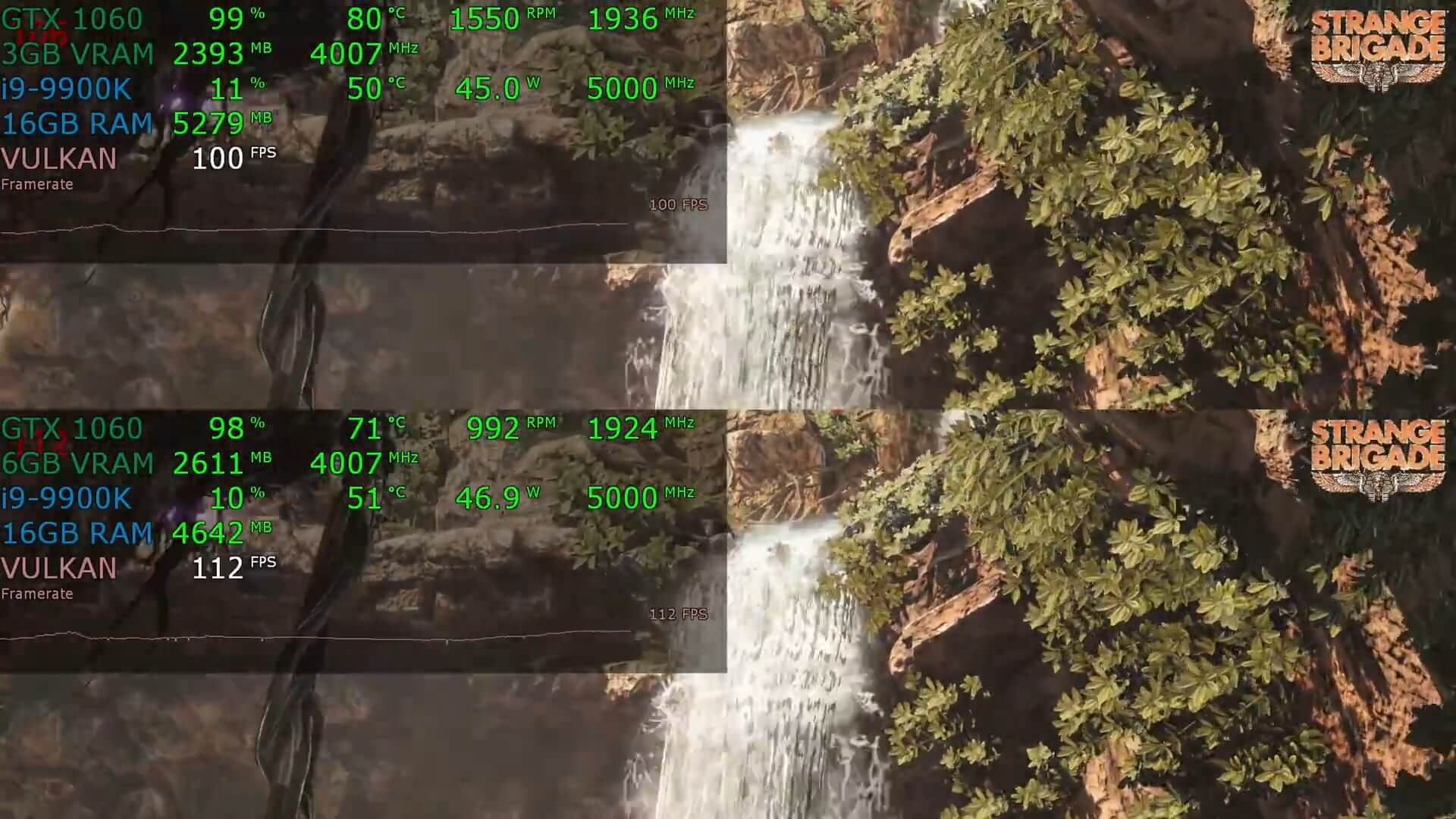 এবার আসা যাক GTX 1060 তে। এখানে আমরা একটি বড় রকমের গ্যাপ দেখতে পাচ্ছি পাফর্মেন্স এ। মোটামুটি দৃশ্যমান পার্থক্য যাকে বলা যায়। ৮০ এফপিএস এবং ৭০ এফপিএস ।(1% low তেও ৯ এফপিএস এর ডিফারেন্স) ১০ ফ্রেম এর পার্থক্য। এখানে সত্যিই স্পষ্ট যে এই সিস্টেমটির জন্য আসলেই ৩ জিবি ভিডিও মেমোরি যথেষ্ট ছিল না এবং ৩ জিবি ভিডিও মেমোরিটিই এখানে বটলনেক ছিল। গেমস গুলোর জন্য ও যথেষ্ট ছিল না । এজন্যই 3 জিবি থেকে 6 জিবি ভির্যাম এ যাওয়ায় পার্ফর্মেন্স বৃদ্ধি পেয়েছে। এমনকি গ্রাফিক্স মেমোরি বটলনেক/লিমিটেশনের জন্য RX 570 থেকেও পিছিয়ে আছে 1060 3GB এডিশন।