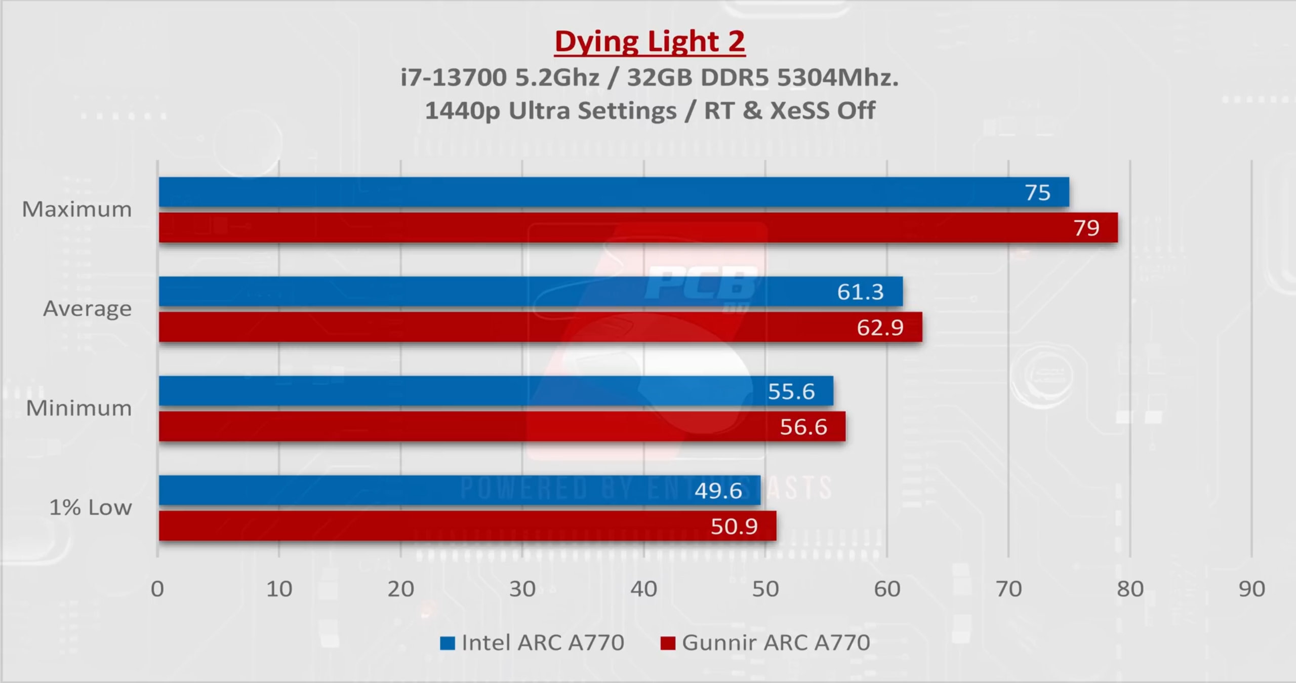 ডায়িং লাইট টু এর স্কোর ও সাইবারপাংক এর মতই সিমিলার,। এভারেজ এ ৬০ এর আশেপাশে, ১% লো ৫০ ছুই ছুই। লাইট এরিয়া গুলোতে এফপিএস ৮০ মত ও উঠতে দেখা গিয়েছে।
