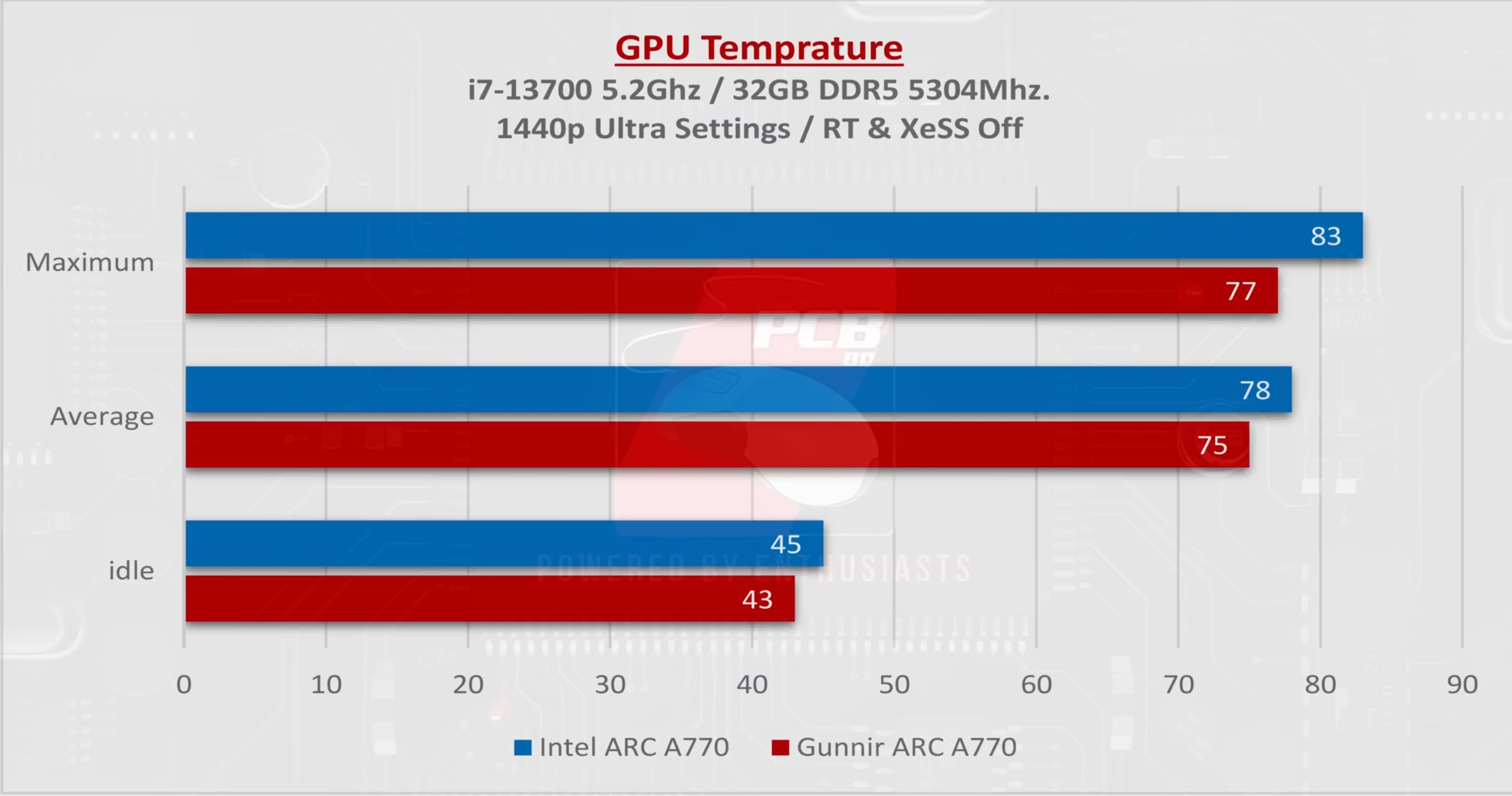 1440p ultra settings এ গেমিং করার সময় এভারেজ টেম্পারেচার ছিল ফাউন্ডারস এডিশনে ৭৮ ডিগ্রী ও গানার এ ৭৫ ডিগ্রী, তবে ম্যাক্সিমাম টেম্পারেচার ফাউন্ডারস এডিশনে অনেকটাই বেশি ছিল, ৮৩ ডিগ্রী পর্যন্ত টেম্পারেচার উঠেছিল ফাউন্ডারসে, স্বাভাবিকভাবেই এ আই বি কার্ড হিসেবে গানার এর টেম্পারেচার ম্যানেজমেন্ট ও কুলিং বেটার হওয়ার কথা, অতিরিক্ত একটি ফ্যান ভালোই কাজ করেছে বুঝা যাচ্ছে। ফাউন্ডারস এর ৮৩ ডিগ্রীর বিপরীতে গানার এর ম্যাক্স টেম্প ছিল ৭৭ ডিগ্রী, যা বেশ ইম্প্রেসিভ।