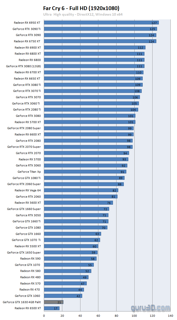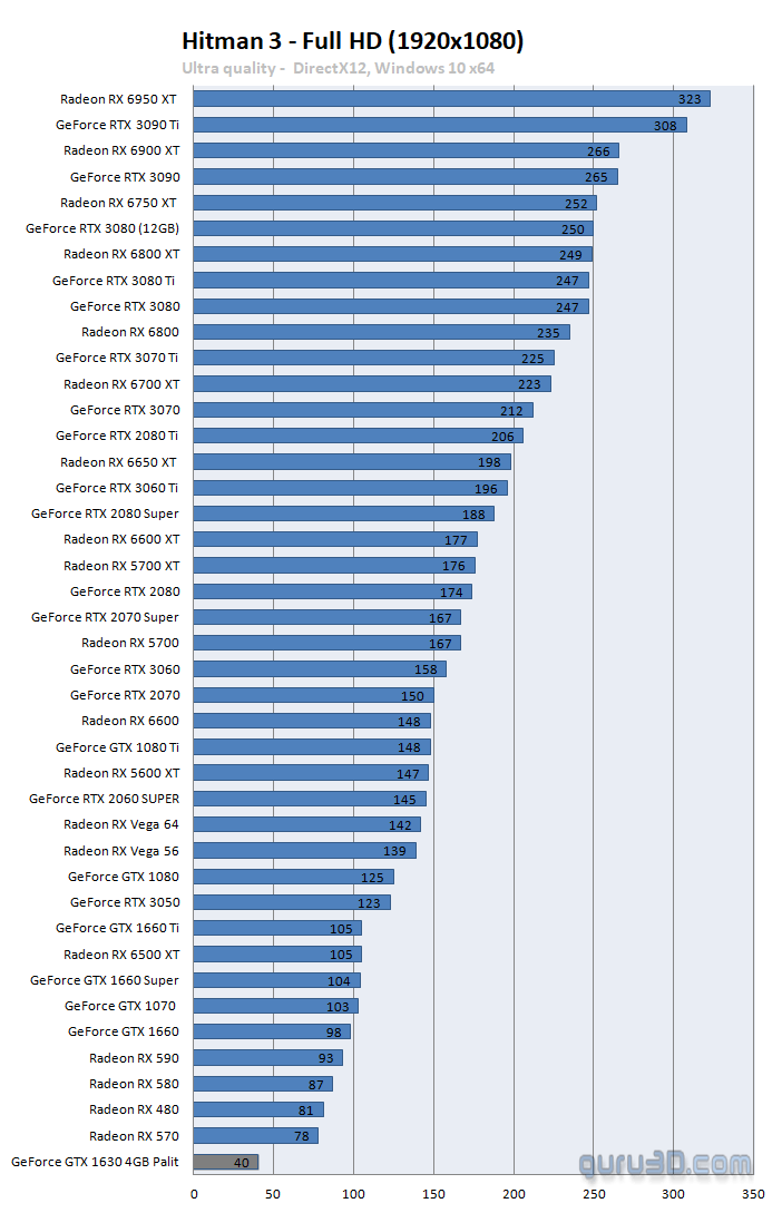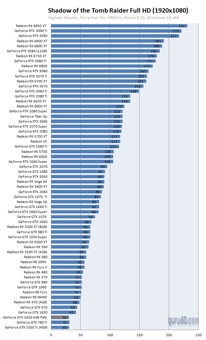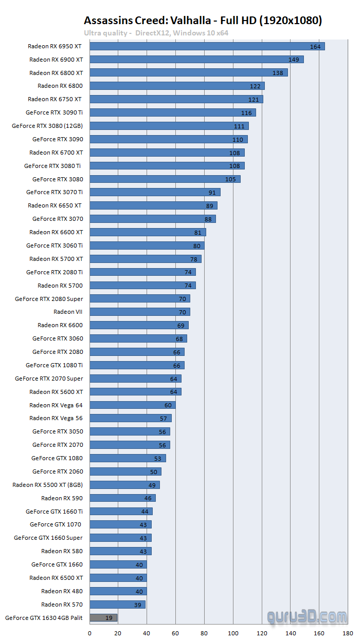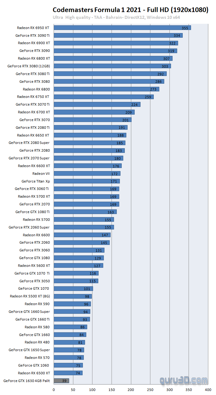 সবকিছুই মেনে নেওয়া যেত যদি পারফর্মেন্স সেকশন,যেটিই সব কিছুর উপরে মুখ্য হয়ে দাঁড়ায়, সেটি ঠিকঠাক থাকতো। তবে স্পেসিফিকেশন কে জাস্টিফাই করে GTX 1630 এখানেও মুখ থুবড়ে পরছে। স্বাভাবিকভাবেই অত্যন্ত কম মেমোরি স্পিড,ব্যান্ডউইডথ,বাস ও ইন্টারফেস এর পাশাপাশি কম সংখ্যক কুডা কোর এর কারণে মডার্ন গেম গুলোতে এর অবস্থা যাচ্ছেতাই।এটি GTX 1650 থেকে অনেক পিছিয়ে আছে ও AMD এর RX 6400 থেকেও পিছিয়ে আছে ভালো ভাবে। মোটামুটি এই জিপিইউটি GTX 1050 Ti এর সমান পারফর্ম করছে।নিচের কিছু গ্রাফ দেখলেই বিষয়টি স্পষ্ট হয়ে যাবে। এমনকি কিছু কিছু গেমে GTX 1050 Ti থেকেও পিছিয়ে যাচ্ছে এটি।