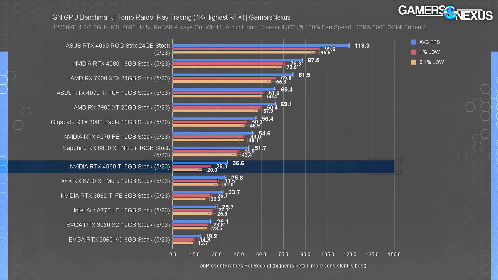 Later he talked about the potential drawbacks of the 8G VRAM with some examples. In the final thought section, he stated that a 4060 Ti with 8GB VRAM shouldn’t cost more than 300 USD. He also said that because the GPU is not too strong, Steve just didn’t test ray tracing on it. He added that frame generation technology will not solve vram issues and performance related issues. He ends his video suggesting that the GPU should be avoided with its 400 USD price.
