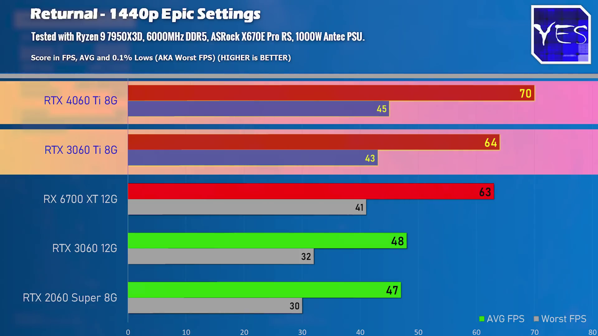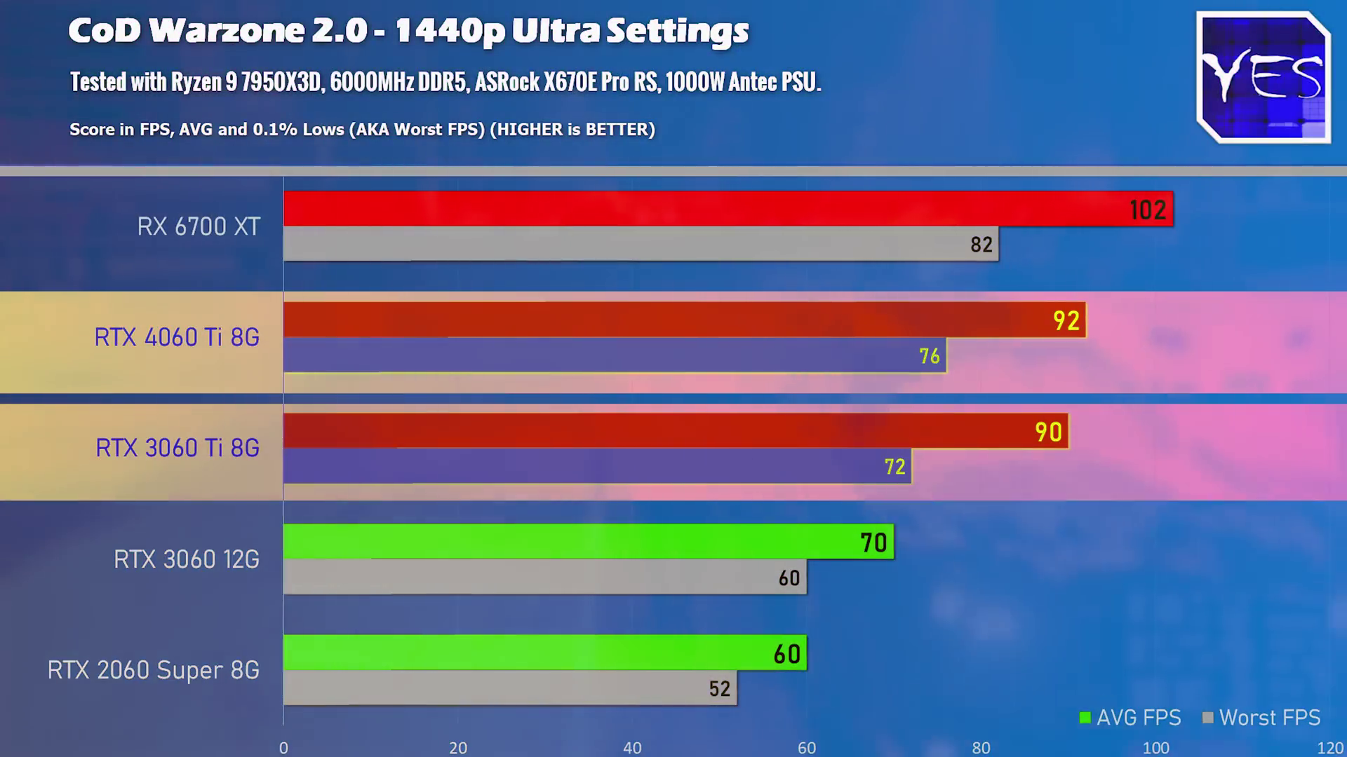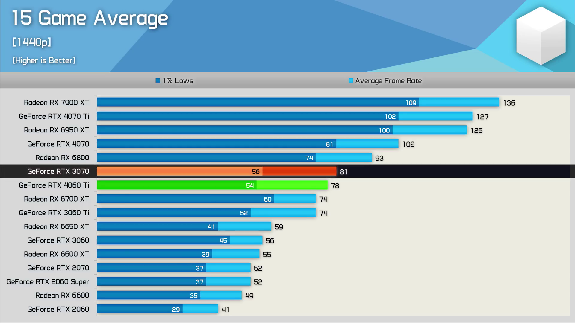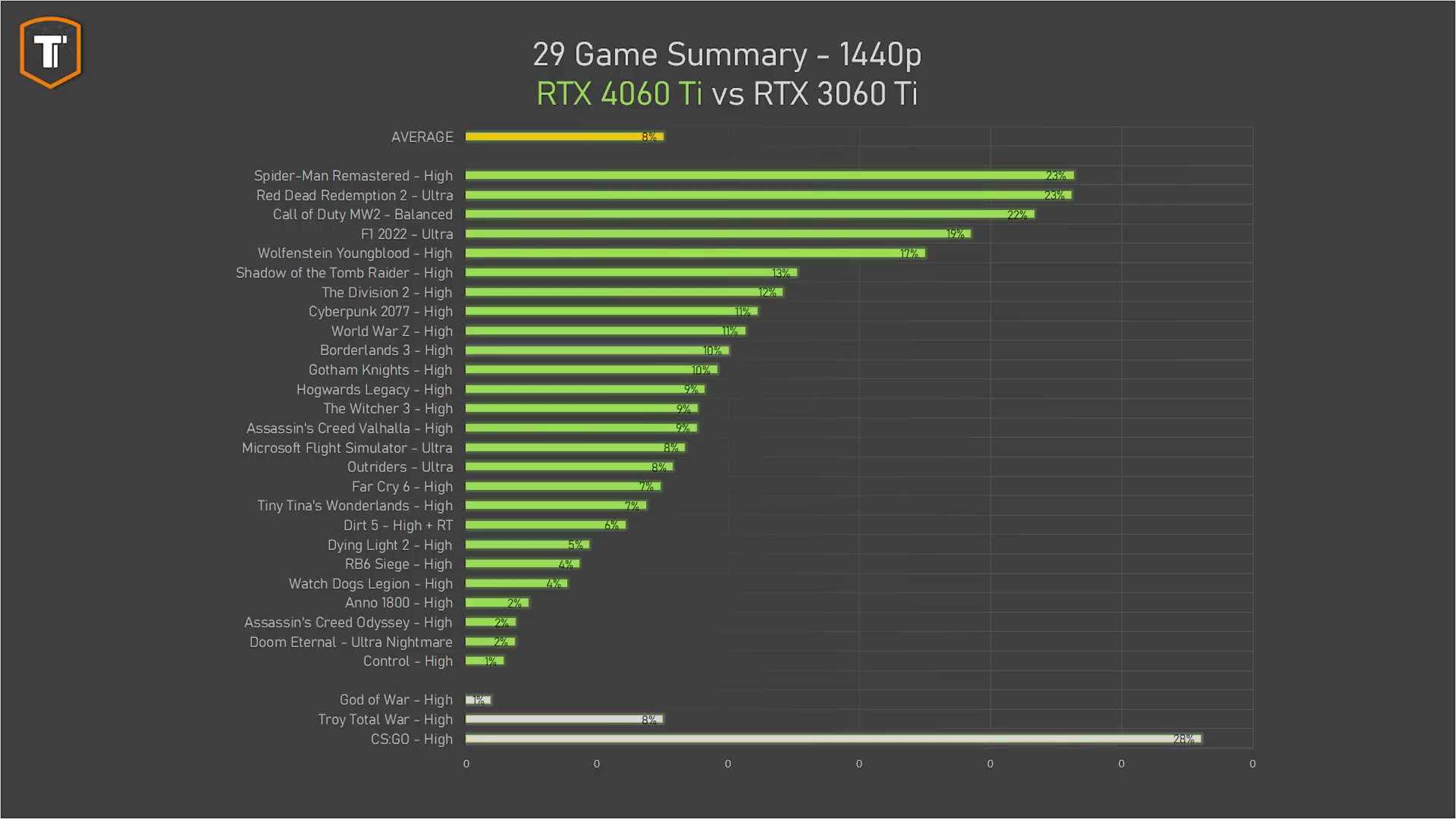 On average of 12 games, 4060 ti was 6% faster than 6700XT and 11% faster than 3060 Ti. In 1440p the gap between 3060 ti and 4060 ti was just 8% . The reason for the struggle is pretty clear, VRAM Capacity and specifications.