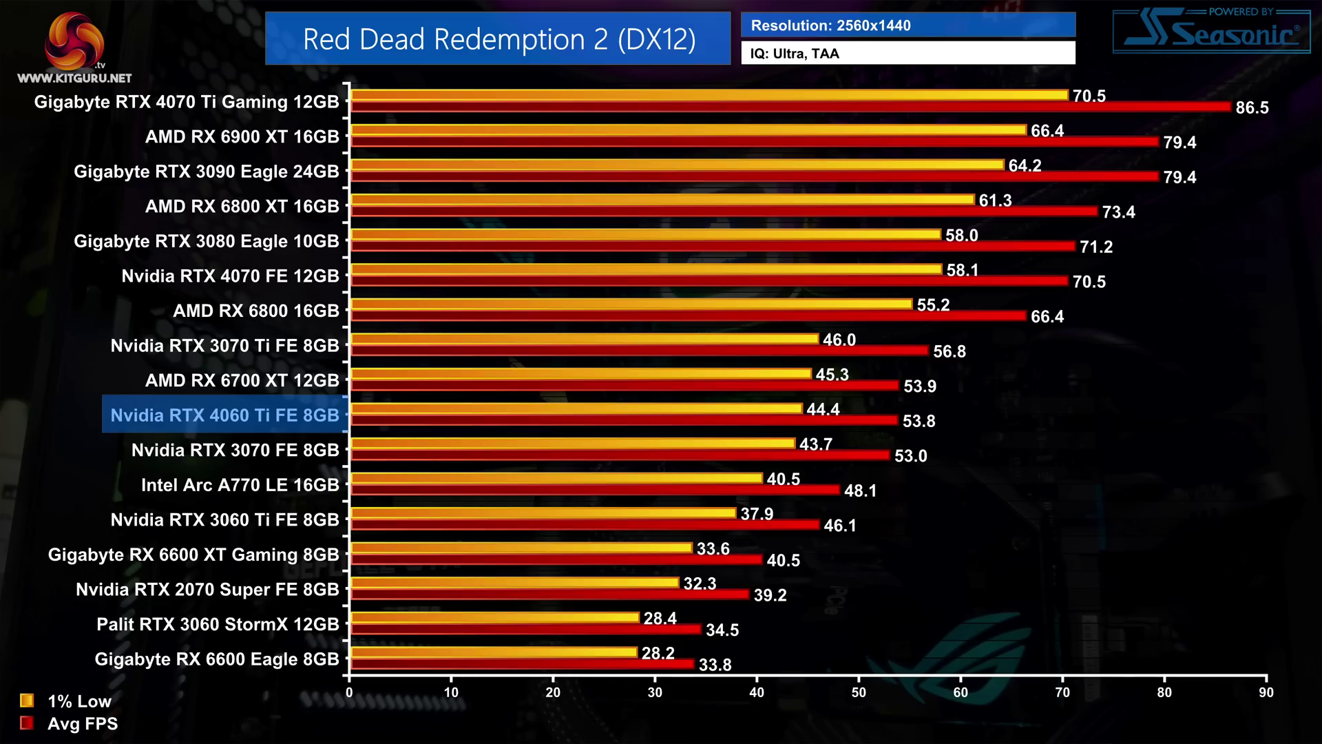 After the intro he compared the specs then the charts started to be shown. In most of the games tested by Kitguru, the 4060 ti was around 10% faster in 1080p than 3060 ti. but in 1440p the lead continuously dropped down to 2-5% and in some cases,nothing. RDR2 was the best title for 4060 ti in terms of generational uplift, it was 19% and 17% faster in 1080p 1440p respectively in this title.