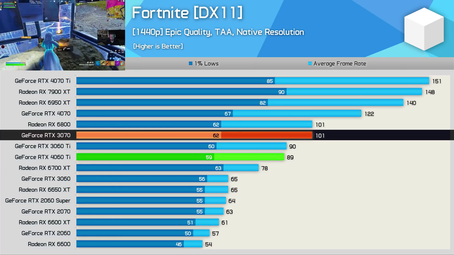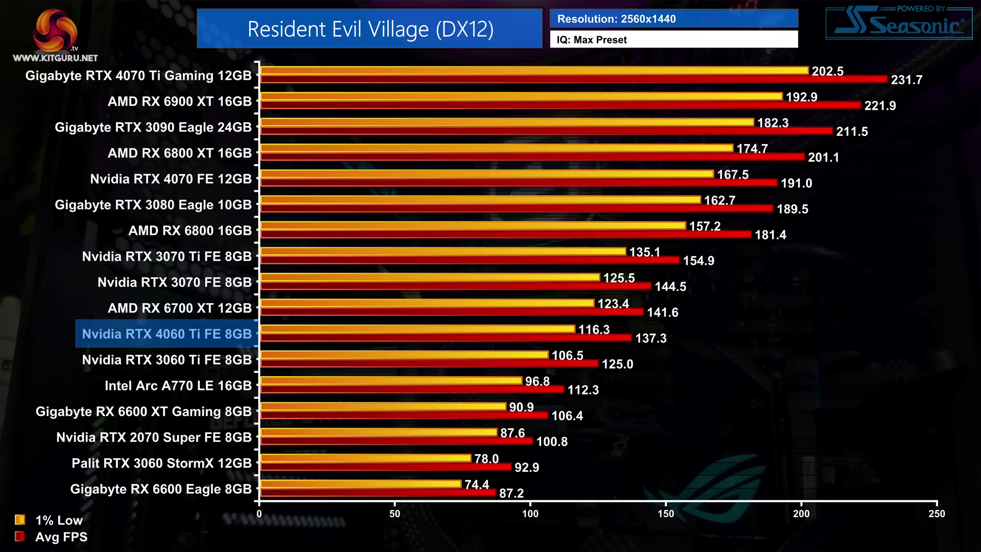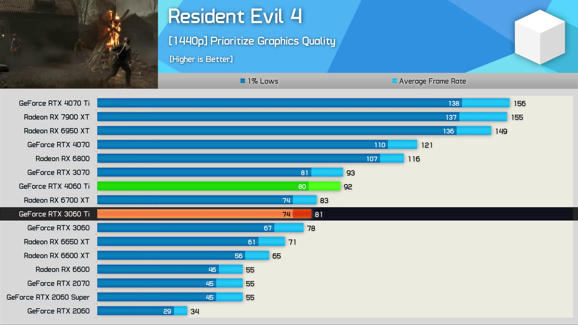 As you can see, in Fortnite, the game was about 5.7% faster than its predecessor in 1080p, and in 1440p it was worse, scoring almost the same as 3060 ti. Next up, In RE4, the 4060 ti was 14% faster than 3060 ti beating the 3070 by a margin of 5% when it was tested in 1080p. In 1440p, it performed same as 3070.