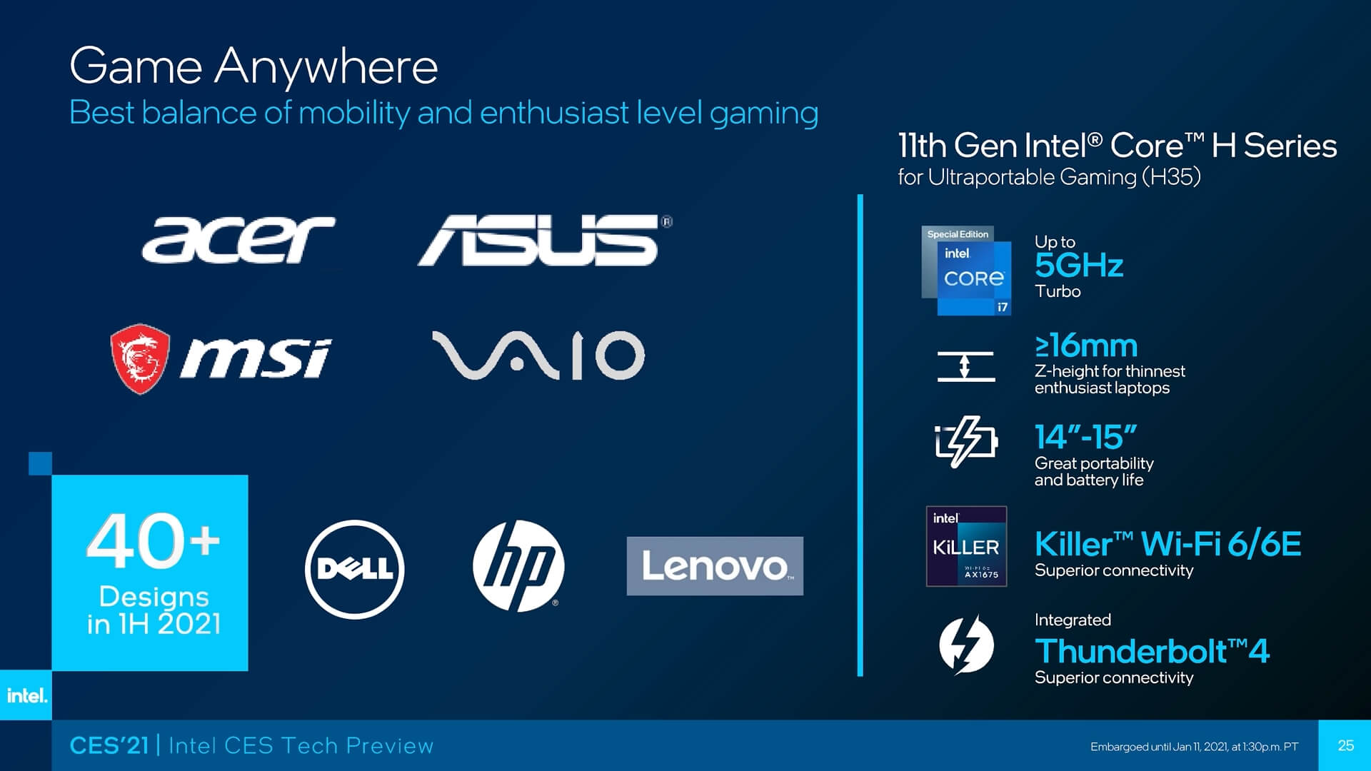 ইন্টেলের H সিরিজের স্পেশাল এডিশন ল্যাপটপ প্রসেসরও একই ইভেন্টে রিভিল হয়েছে। ২৮ ওয়াটের বদলে এখানে Power limit থাকবে 35W। 5Ghz পর্যন্ত ক্লক স্পিড এর কথা উল্লেখ করেছে Intel। এই নতুন H35 এর স্লোগান হচ্ছে Enthusiast Gaming On the Go, অর্থাৎ গেমারদের কথা মাথায় রেখে বিশেষভাবে প্রস্তুত করা হয়েছে এই প্রসেসর। থাকছে Wifi6,Wifi6E ,Thunderbolt 3 এর মত সব ফিচার।