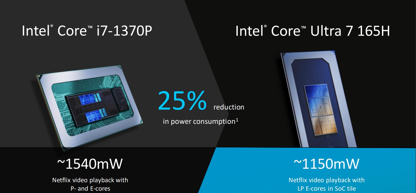 দ্বিতীয়ত, Foveros Technology এর আরেকটি সুবিধার দিক হচ্ছে এর পাওয়ার এফিশিয়েন্সি বা কর্মদক্ষতা, কম পাওয়ার ব্যবহার করে বেশি পারফর্মেন্স পাওয়া যায় এই ডিজাইনের ডিভাইসগুলোতে। Core i7 1370P থেকে 2.5x AI processing efficiency, zoom video call এ ৩৮% কম পাওয়ার ব্যবহার করবে এই প্রসেসরগুলো।
