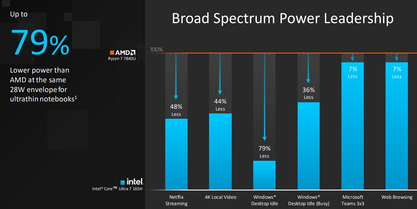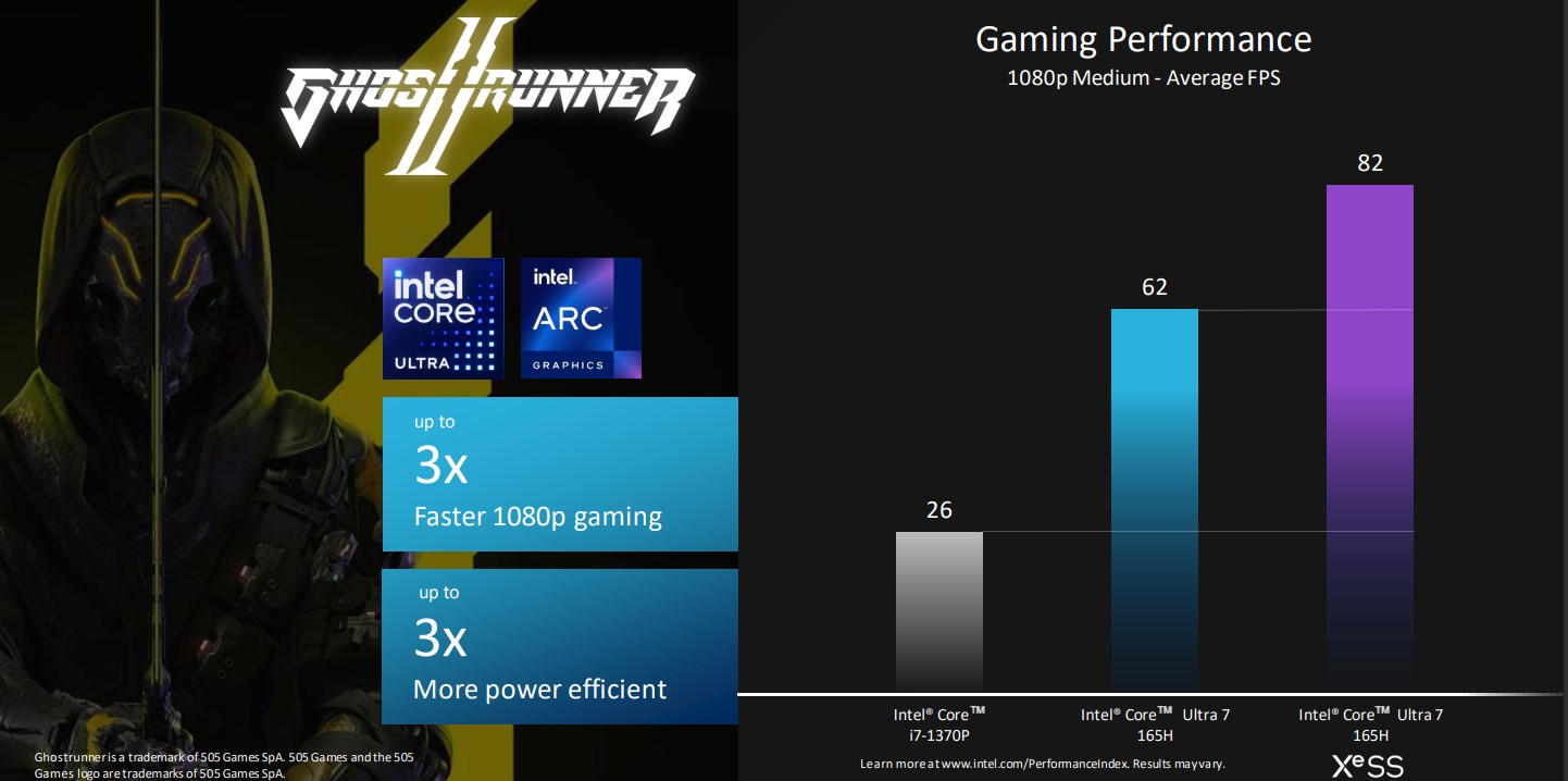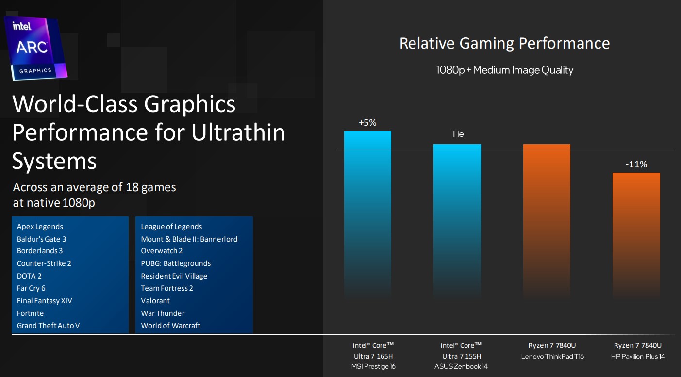 ২৮ ওয়াটে গেমিং এ 13th Gen Intel core i7 প্রসেসর থেকে সর্বনিম্ন ৯% থেকে সর্বোচ্চ ১০০% এর পারফর্মেন্স এর পার্থক্য গড়ে তুলতে পেরেছে এই নতুন প্রসেসর। গড়ে AMD 7840U এর সাথে Ultra 7 155H একই অবস্থানে আছে কিন্ত Ultra 7 165H অবশ্য ৫% ব্যবধানে এগিয়ে রয়েছে। Raw performance এর পাশাপাশি XeSS Upscaling এর কার্যক্ষমতা ও দেখিয়েছে ইন্টেল।