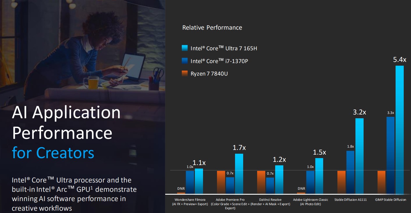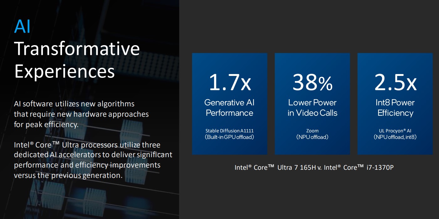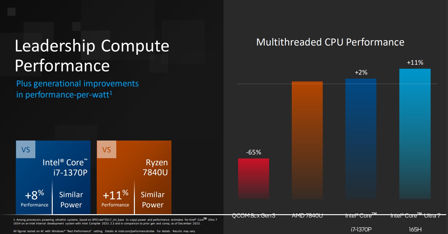 AI,GPU ও CPU ৩টি সেকশনেই বেশ অনেকগুলো পারফর্মেন্স স্লাইড প্রদর্শন করেছে ইন্টেল।সিঙ্গেল থ্রেডে একই পরিমাণ পাওয়ারে AMD 7840U থেকে Ultra 5 165H ১২% ব্যবধানে এগিয়ে রয়েছে। মাল্টিকোর বা মাল্টিথ্রেডে এই ব্যবধান ১১%। একই সাথে i7 1370P থেকে প্রসেসরটির পারফর্মেন্স এর পার্থক্য ৯% ।