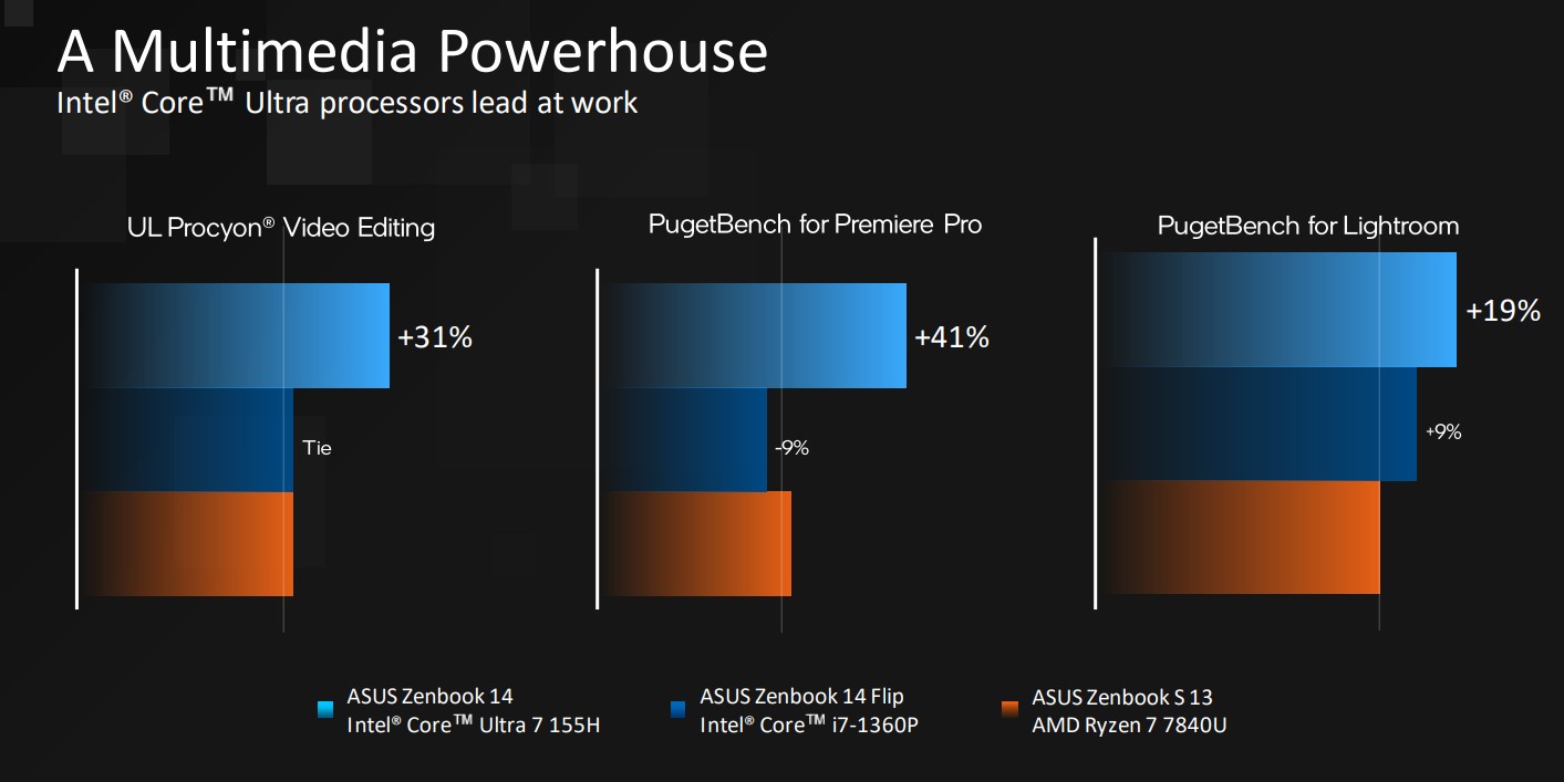 ইন্টেলের স্লাইড অনুসারে নতুন এই প্রসেসরগুলো Procyon,Premiere Pro ও Lightroom এর মত প্রোডাক্টিভ এপ্লিকেশনগুলোতেও AMD প্রসেসর থেকে বেশ ভালো ব্যবধানে এগিয়ে থাকবে।