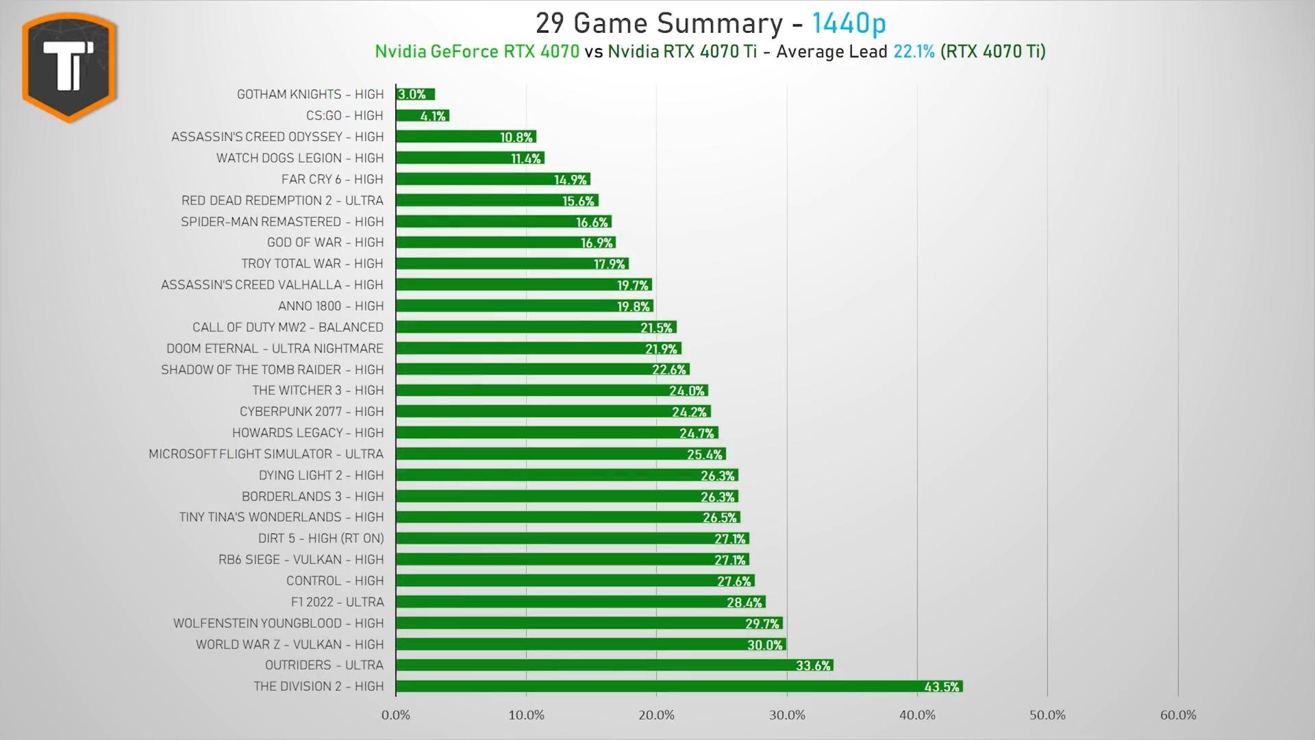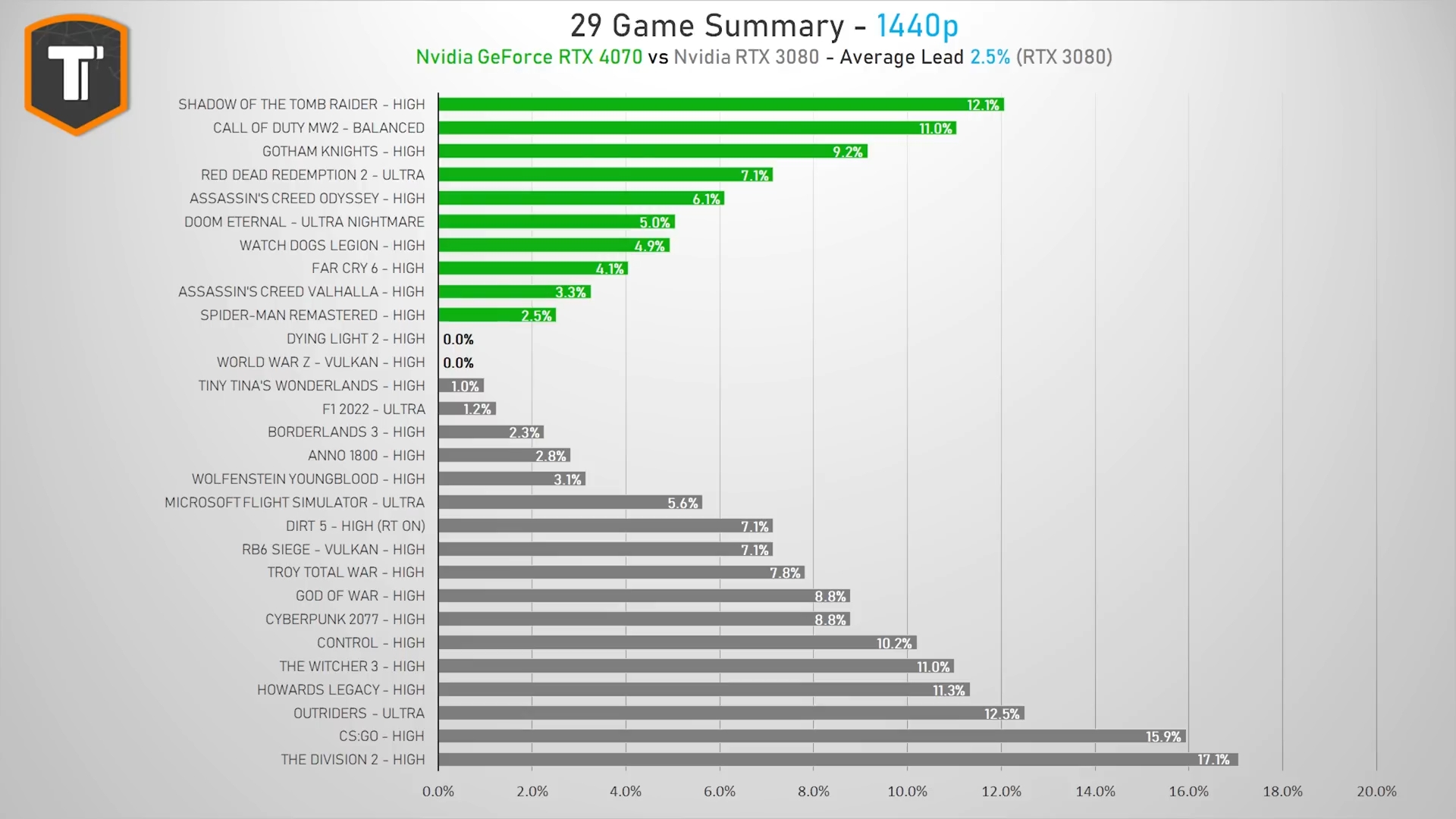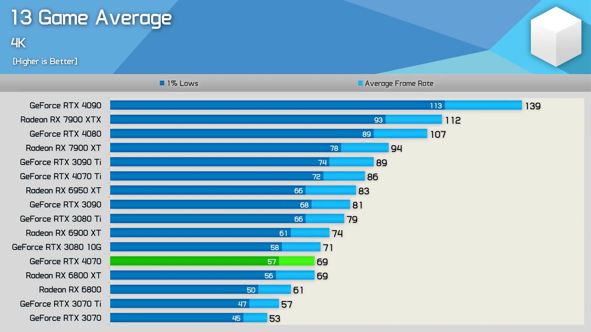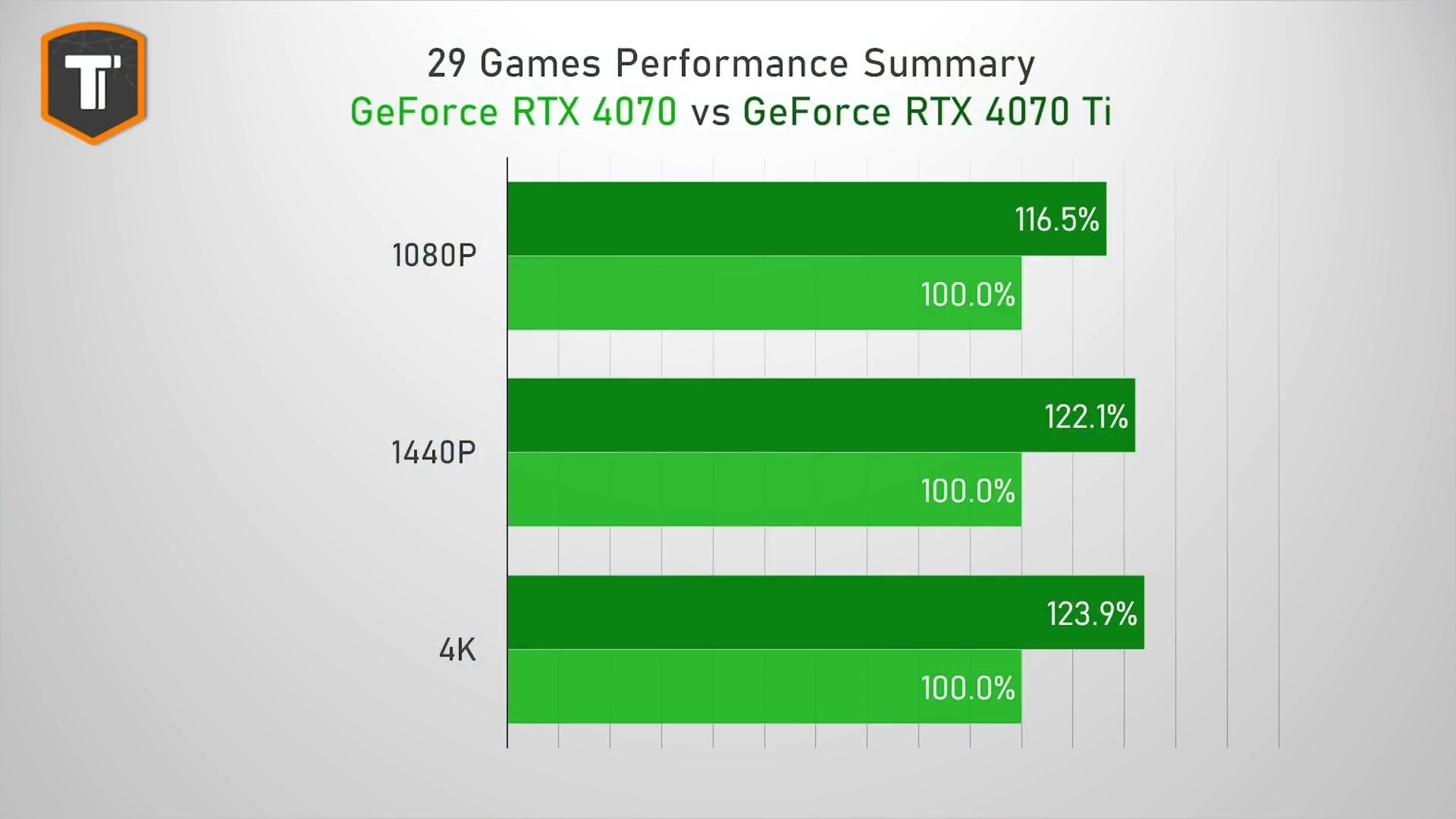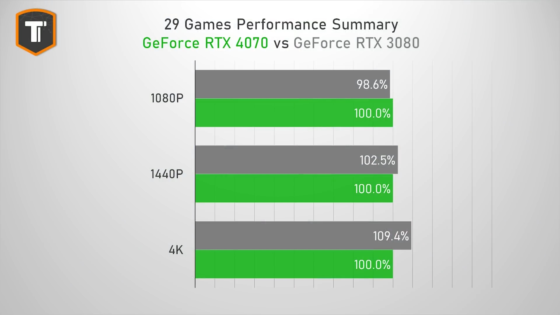 3rd party রিভিউ গুলো দেখে মোটামুটি যেটা বোঝা যাচ্ছে যে RTX 4070 এর পারফর্মেন্স RTX 3080 10GB এর সমান ও AMD এর RX 6800 XT এর সমান। Techtester এর test এ RTX 3070 থেকে 2k রেজুলুশনে গড়ে ২৫% এগিয়ে আছে RTX 4070 ও RTX 4070 ti থেকে গড়ে ২০% পিছিয়ে আছে 4070 ।