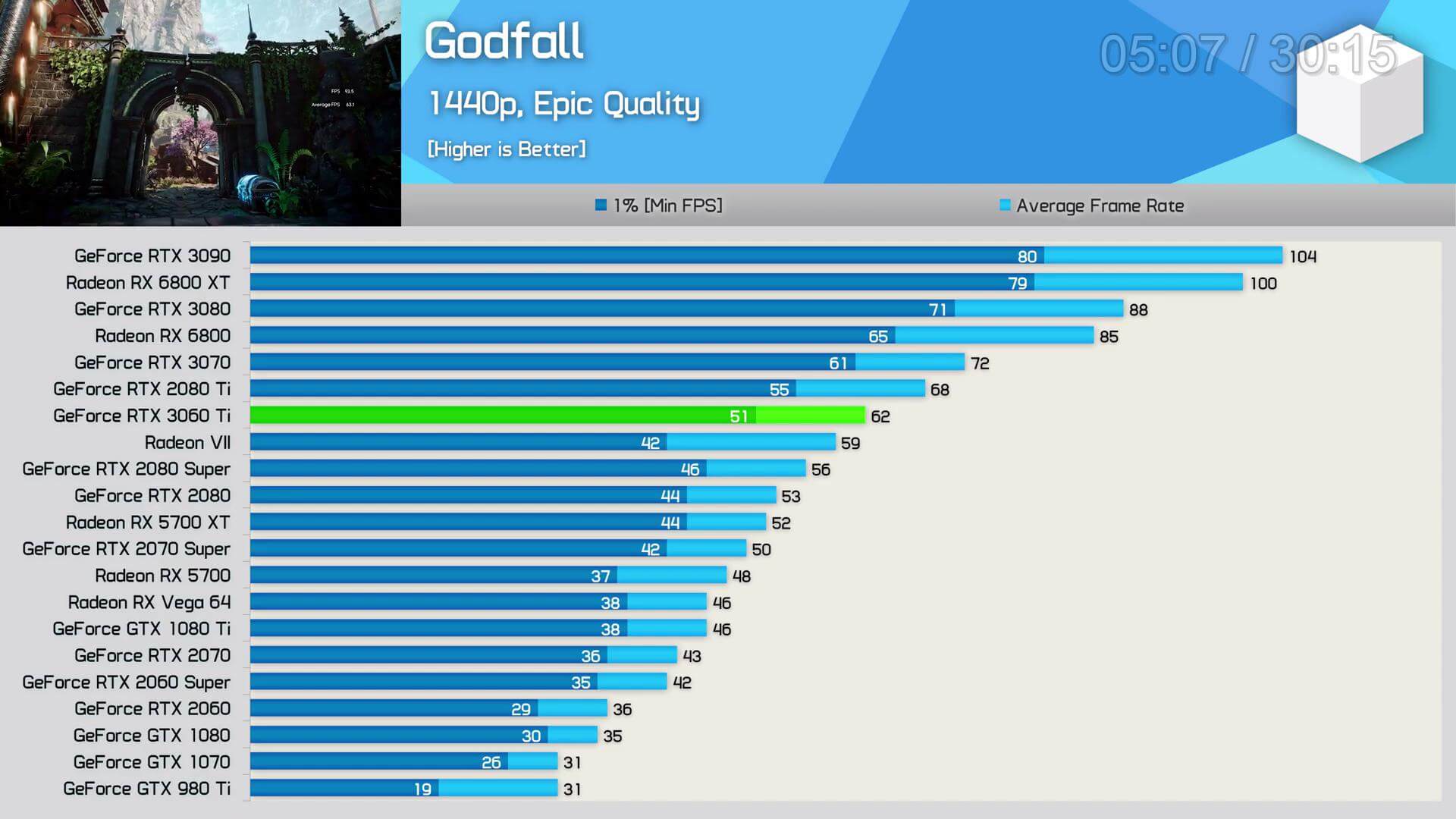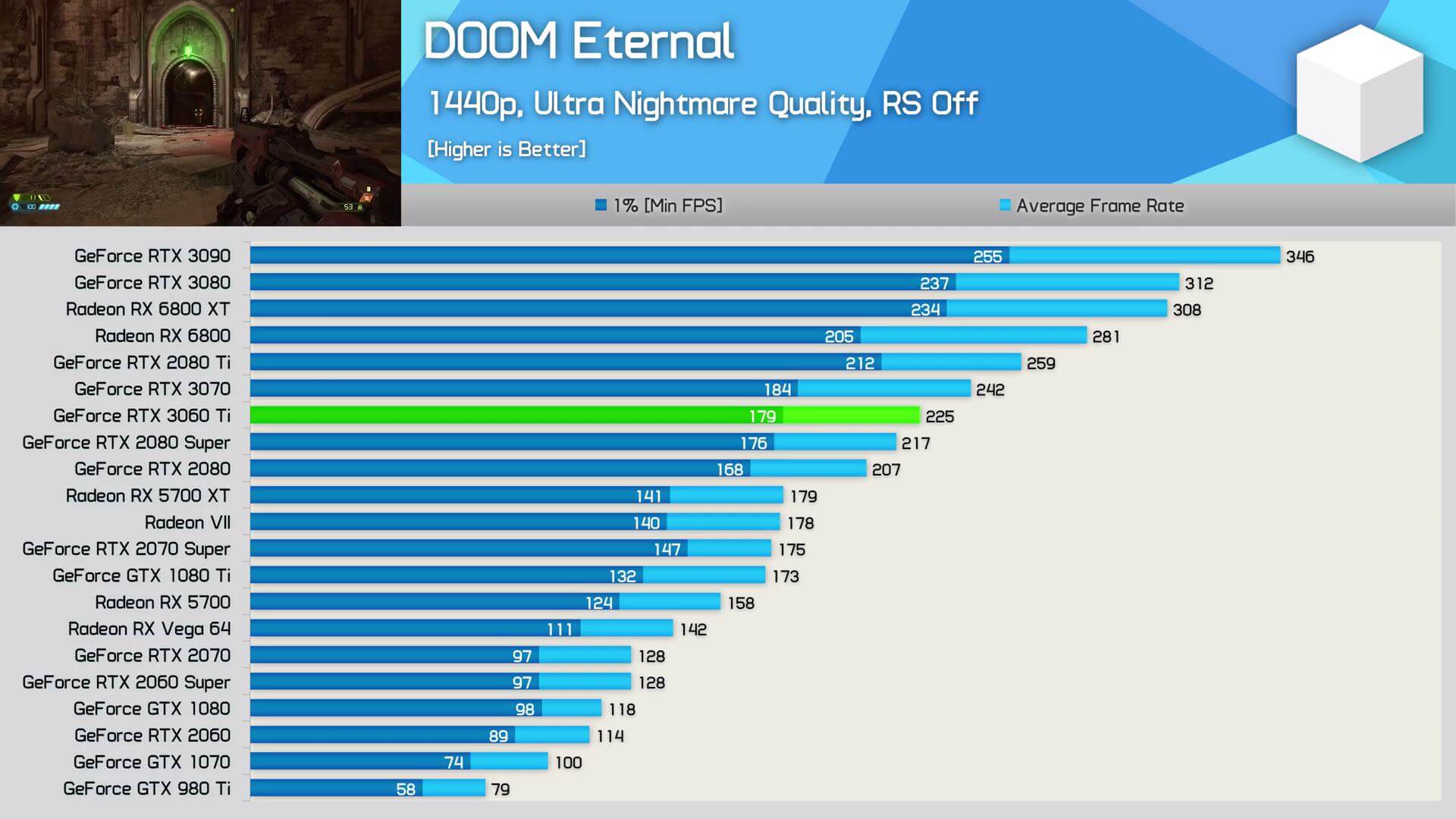১৮টি গেমের গড়ে নতুন এই কার্ডটি RX 5700XT থেকে ২০ এফপিএস এগিয়ে রয়েছে ,2070S এর সাথেও প্রায় একই ব্যবধান। 1440p তেও দুটি কার্ডের থেকেই 3060 Ti একই ব্যবধানে এগিয়ে আছে। 4K এর ক্ষেত্রেও শতকরা হিসেবে পারফর্মেন্স অপেক্ষাকৃত ভালো।