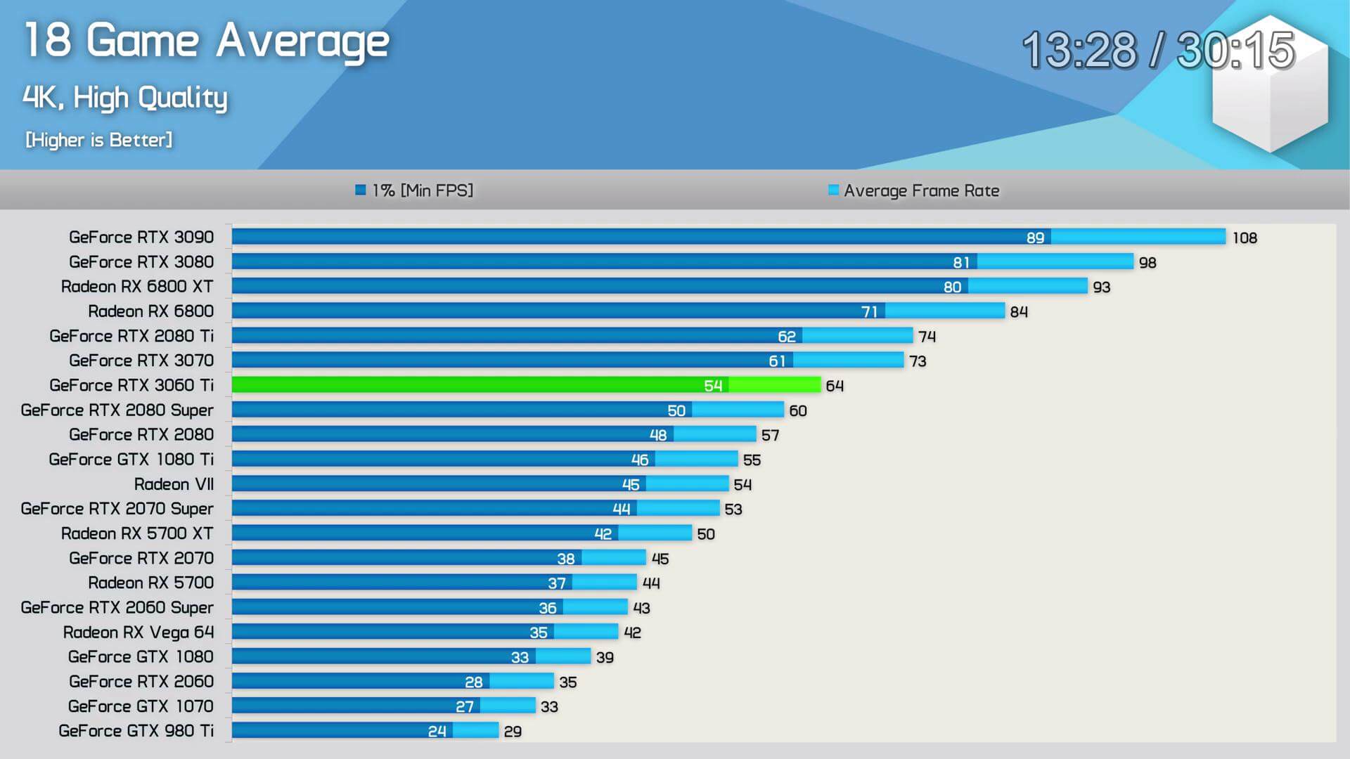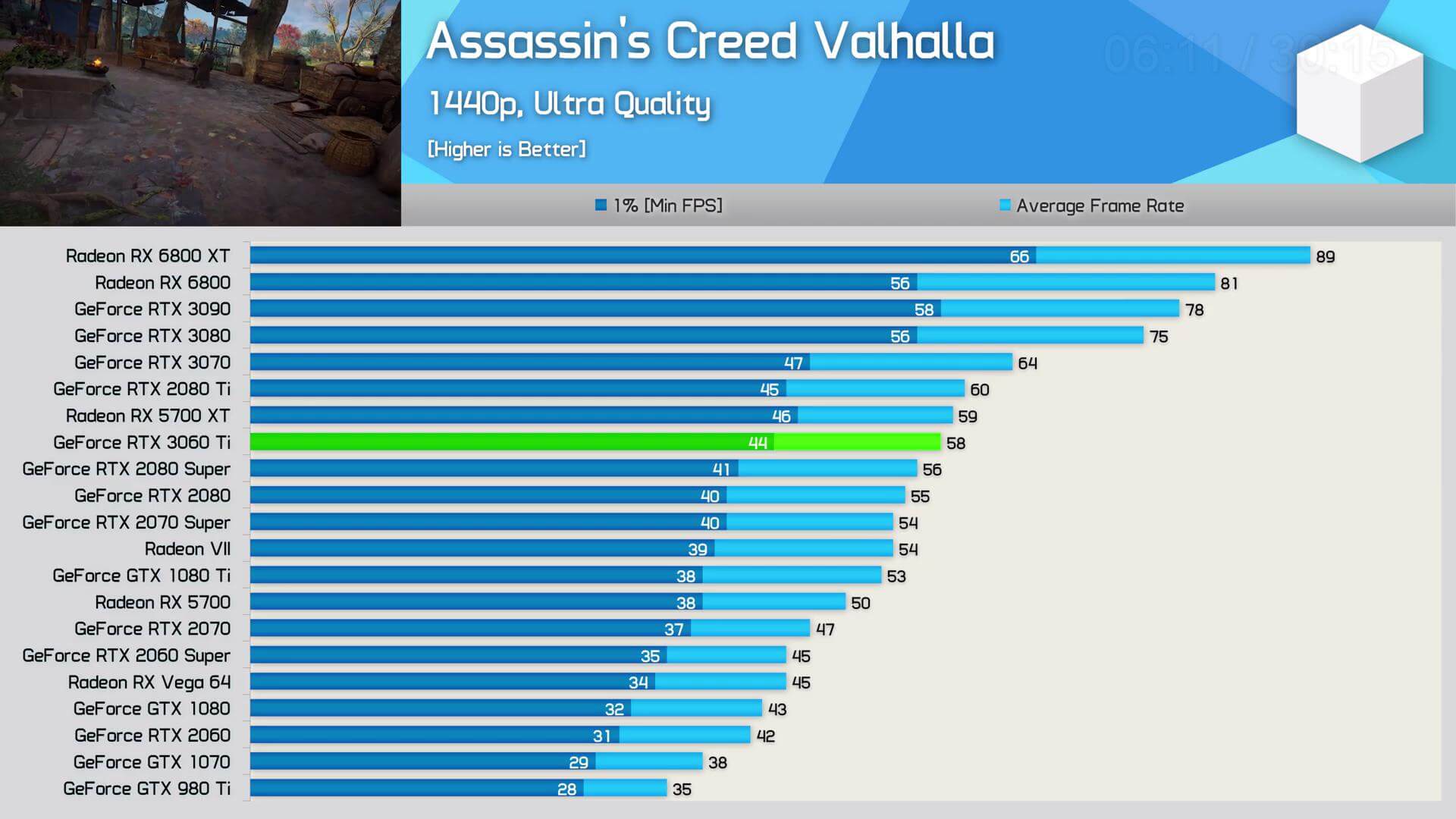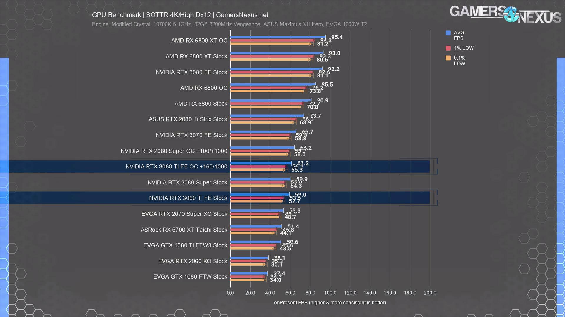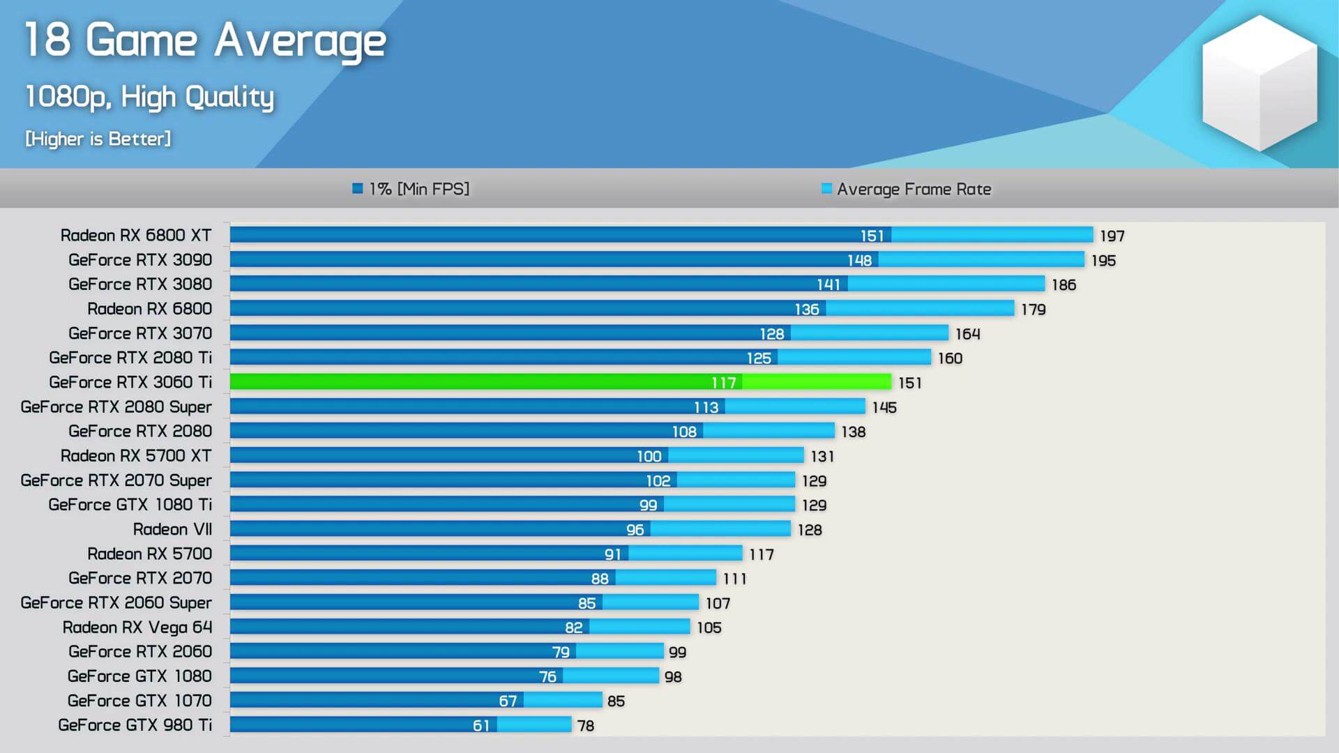 স্বনামধন্য প্রায় সবগুলো রিভিউয়ারেরই RTX 3060 Ti এর রিভিউ ইতিমধ্যেই published হয়ে গিয়েছে। এখান থেকে মোটামুটি বেশ আইডিয়া পাওয়া যাচ্ছে যে গ্রাফিক্স কার্ড ইন্ডাস্ট্রিতে এর অবস্থান কোথায়। নিচে Hardware Unboxed এবং Gamers Nexus এর রিভিউ থেকে সংগ্রহীত কিছু গেমের বেঞ্চমার্ক রেজাল্ট দেওয়া হলো।