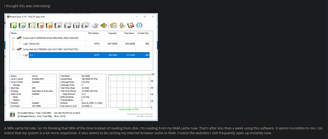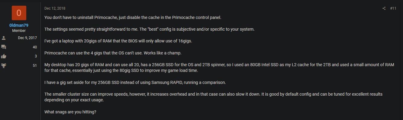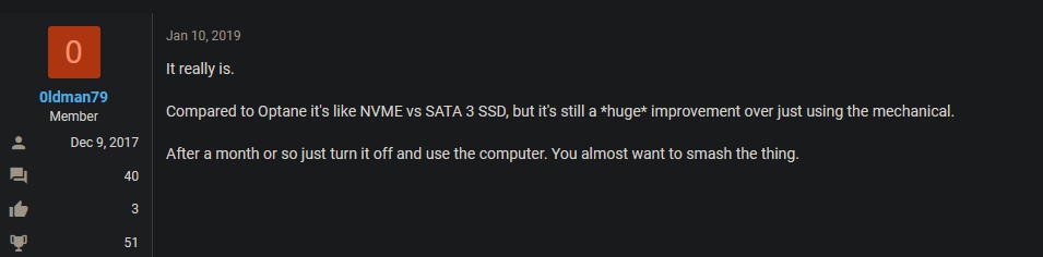বিভিন্ন ফোরাম ঘেটে ,কমেন্ট,ডিসকাশন পড়ে প্রচুর পরিমানে পজিটিভ ফিডব্যাক আমি পেয়েছি। সেগুলোর মধ্যে কিছু এখানে দিয়ে দিলাম।। তারপর আমরা সরাসরি আলোচনায় চলে যাব যে কিভাবে এটি ইন্সটল করে,কিভাবে DRAM Cache,L2 Cache সেটআপ করতে হয়। নিচের স্ক্রিনশটগুলো Hardforum,Linustechtips,Anandtech থেকে নেওয়া।গেমিং এর লোডিং টাইম,app loading time,copy cut/move এর স্পিড অনেক বেশি পাওয়ার কথা উল্লেখ করেছেন ইউজাররা।