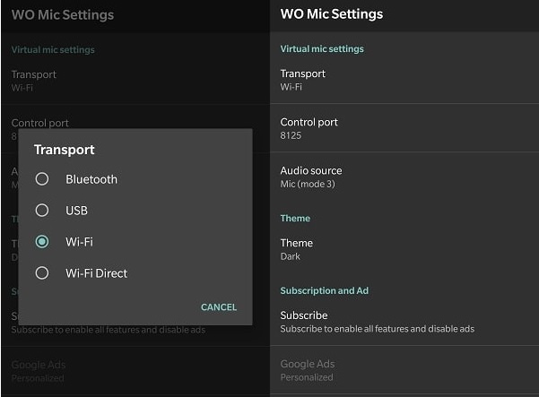 Wo Mic অ্যান্ড্রয়েড অ্যাপ চালু করুন। সেটিংয়ে যান। Transport ঘরে ট্যাপ করে Wi-Fi অপশনটিকে সিলেক্ট করুন।