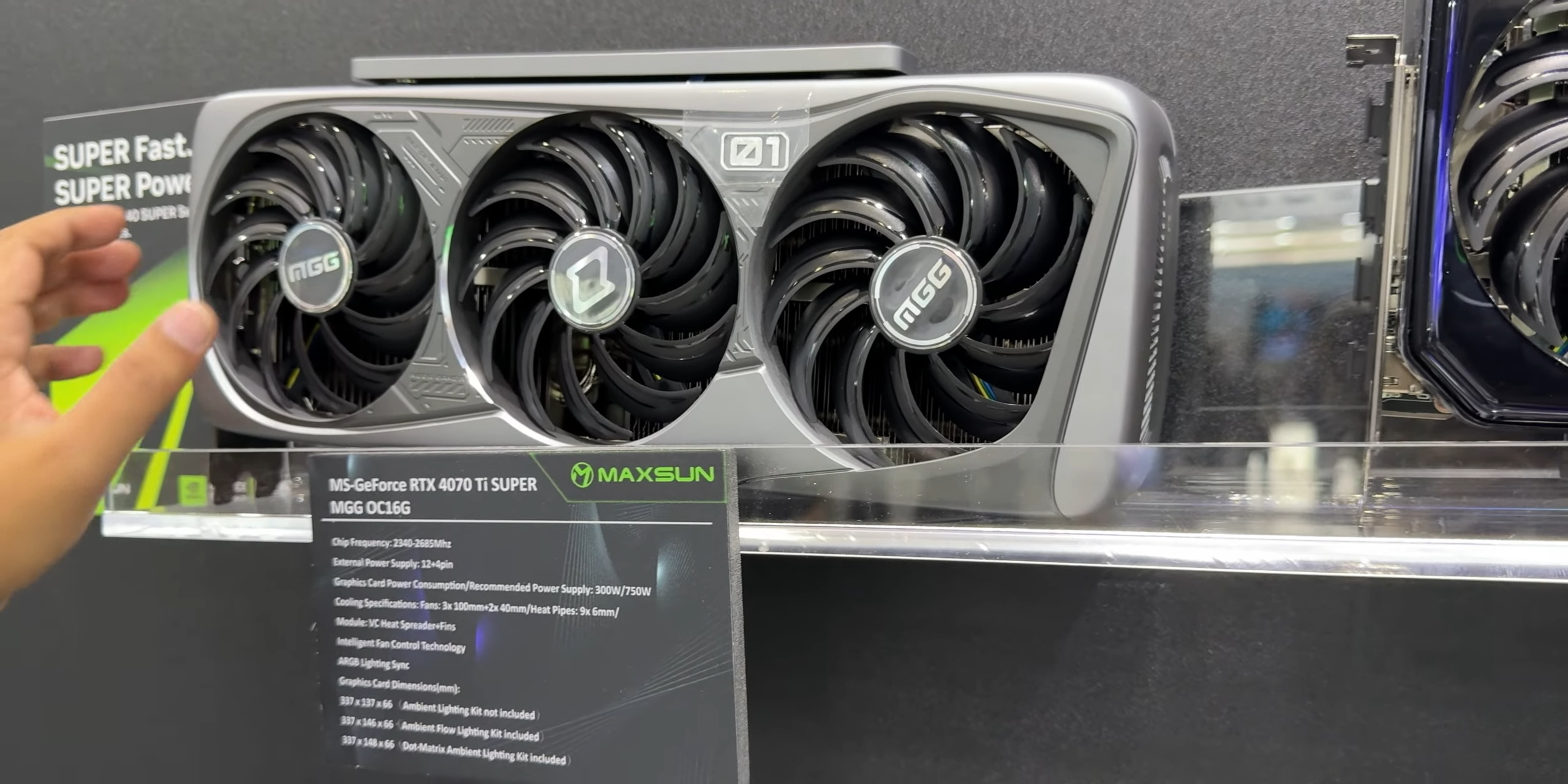 এছাড়াও আরেকটি কার্ডের কথা বলতে হয়,Maxsun MGG RTX 4070 Ti Super। যেটায় মোট ফ্যান সংখ্যা ৫টি। ৩টি বড় ফ্যান গতানুগতিক স্থানে থাকলেও আরো দুইটি ছোট ফ্যান রয়েছে হিটসিংকের দুই কোনায়।