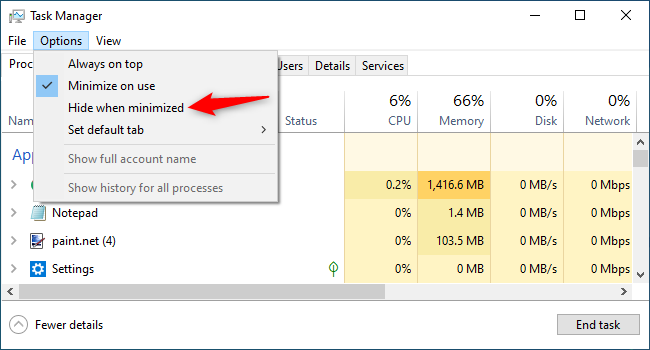 আপনি চাইলে এটাকেও টাস্কবার থেকে হাইড করে রাখতে পারেন। এটি করতে টাস্ক ম্যানেজার উইন্ডোতে click করুন এবং Options মেন্যু থেকে Hide when minimized অপশনটি সিলেক্ট করে দিন।