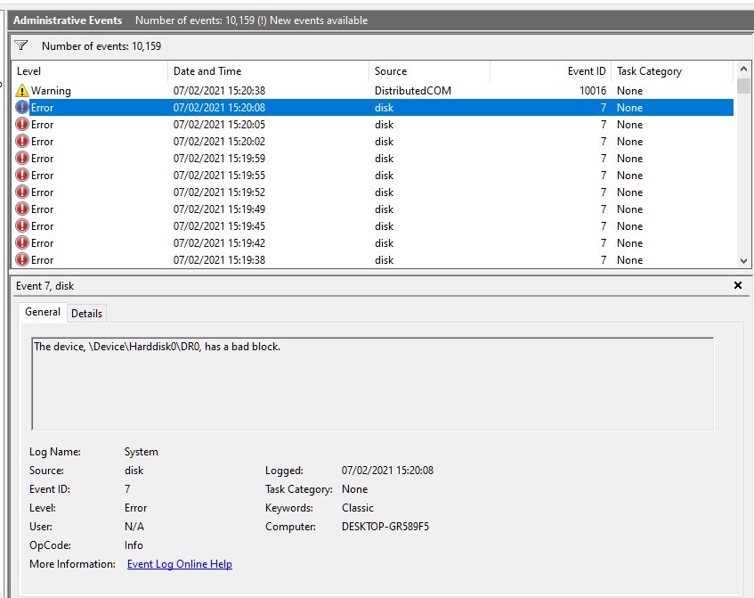 -লাগাতার হার্ডড্রাইভ এর ব্যাড ব্লক সম্পর্কে ইভেন্ট লগে Error মেসেজ আসতো
