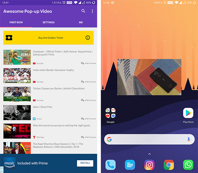 আমাদের আজকের লিস্টের সর্বশেষ স্থানে রয়েছে Awesome Pop-up Video অ্যাপটি। আর নামেই বুঝতে পারছেন অ্যাপটি দিয়ে ভিডিও মানে ভিডিওগুলো পপ-আপ হিসেবে আপনি স্মার্টফোনে চালাতে পারবেন। এই অ্যাপটির হোমপেজে গেলেই বুঝবেন যে ভিডিওগুলো ইউটিউবের, আর সার্চ দিলেও সেটা ইউটিউবের সার্চ রেজাল্ট দেখাবে। তবে শুধুমাত্র ইউটিউব নয় বরং অনান্য ভিডিও শেয়ারিং প্লাটফর্ম (যেমন Vimeo) গুলোতেও আপনি এই অ্যাপটি ব্যবহার করতে পারবেন। তবে ফেসবুক, টুইটারের ভিডিওগুলো এখানে সার্পোট করবে না। অ্যাপটি ডাউনলোড করতে এখানে ক্লিক করুন।
