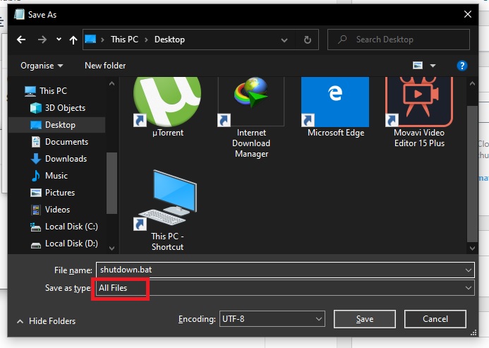 এবার ফাইলটি shutdown.bat নামে সেভ করুন। উল্লেখ্য যে, এজন্য ফাইল টাইপ ড্রপ ডাউন মেন্যু থেকে All Files করে নিতে ভূলবেন না যেন।